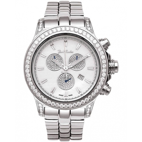 Wear proudly this magnificent diamond watch for men by Joe Rodeo JMP06 from Master Pilot collection. It has durable stainless steel case, bracelet and bezel that encrusted with one row of genuine white diamonds totaling 7.20 carats. The watch also features white mother-of-pearl dial with pave sub-dials, and goes with two extra straps of different colors. For accurate time, it is equipped with high-quality Swiss quartz movement that has chronograph and date functions. 24diamonds.com is official dealer of Joe Rodeo, so you will get 1-year factory warranty and professional after-warranty service. Please check the video below for more details.
