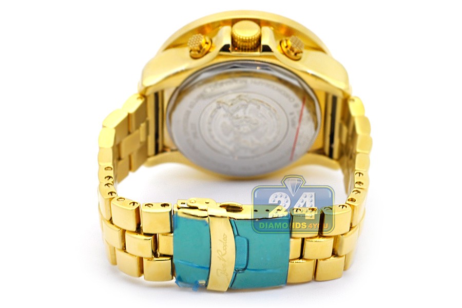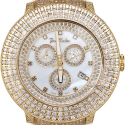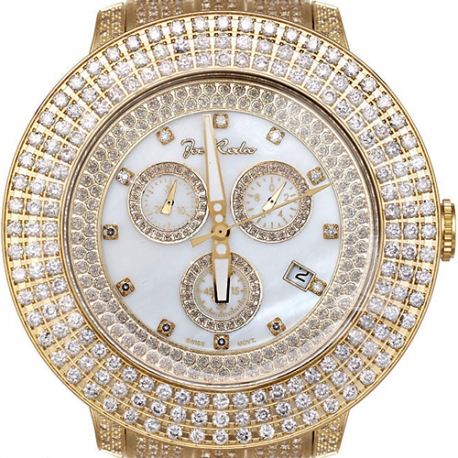 Make a luxurious statement wearing this men's diamond watch JRPL6 by Joe Rodeo from Pilot collection. It features durable stainless steel case, bracelet and bezel covered with long-lasting yellow gold plating; and encrusted with three rows of natural white diamonds, all totaling 11.00 carats. The watch also has white dial with three sub-dials, and comes with two extra straps of different colors. For accurate time, it is equipped with high-quality Swiss quartz movement that has chronograph and date functions. We're official dealer of Joe Rodeo, so you will get 1-year factory warranty and professional after-warranty service.
