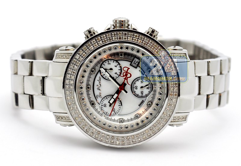 Stunning lady's diamond watch JRO1 from the most popular Rio collection designed by Joe Rodeo of New York. Its case and bracelet are produced from durable stainless steel, and highly polished for smooth shimmering finish. The bezel and lugs are set with 140 genuine diamonds, all weighting 1.25 carat. White mother-of-pearl dial is protected by scratch resistant mineral crystal. The timepiece also features Swiss quartz movement that has date and chronograph functions. Original packaging includes extra two bands of different colors. Add a stylish detail to your look!