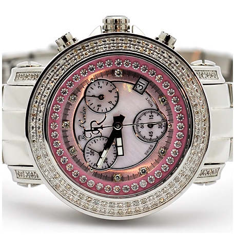 Get impressive look wearing this lady's diamond watch JRO4 from the most popular Rio series designed by Joe Rodeo of New York. Its case and bracelet are made of durable stainless steel, and highly polished for smooth shimmering finish. The bezel and lugs are set with 140 genuine diamonds, all weighting 1.25 carat. Pink mother-of-pearl dial is protected by scratch resistant mineral crystal. The timepiece also features Swiss quartz movement that has date and chronograph functions. Original packaging includes extra two bands of different colors. Truly fashionable diamond watch!