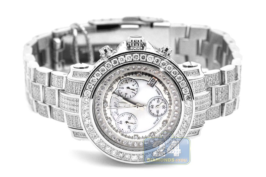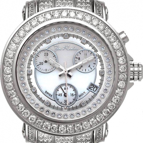 Truly luxurious and stylish women's diamond watch JRO8 from the most popular Rio series designed by Joe Rodeo of New York. Its case and bracelet are produced from durable stainless steel; and encrusted with 890 natural diamonds, all totaling 9.50 carats. White mother-of-pearl dial with three sub-dials is protected by scratch resistant mineral crystal. The timepiece also features Swiss quartz movement that has date and chronograph functions. Original packaging includes extra two bands of different colors. Statement-making diamond watch!