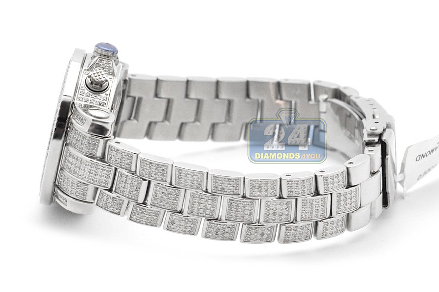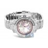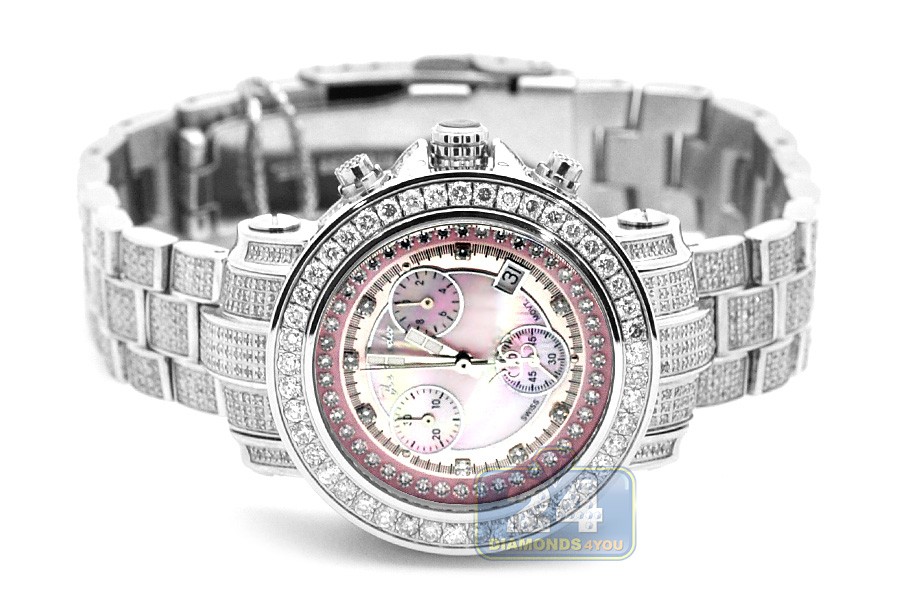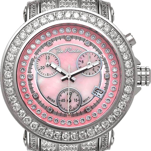 Rich-looking lady's diamond watch JRO9 from the most popular Rio series designed by Joe Rodeo of New York. Its case and bracelet are made of durable stainless steel with high-polished smooth finish; and amazed with 890 natural diamonds, all totaling 9.50 carats. Pink mother-of-pearl dial with three sub-dials is protected by scratch resistant mineral crystal. The timepiece also features Swiss quartz movement that has date and chronograph functions. Original packaging includes extra two bands of different colors. Make a stunning statement!