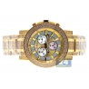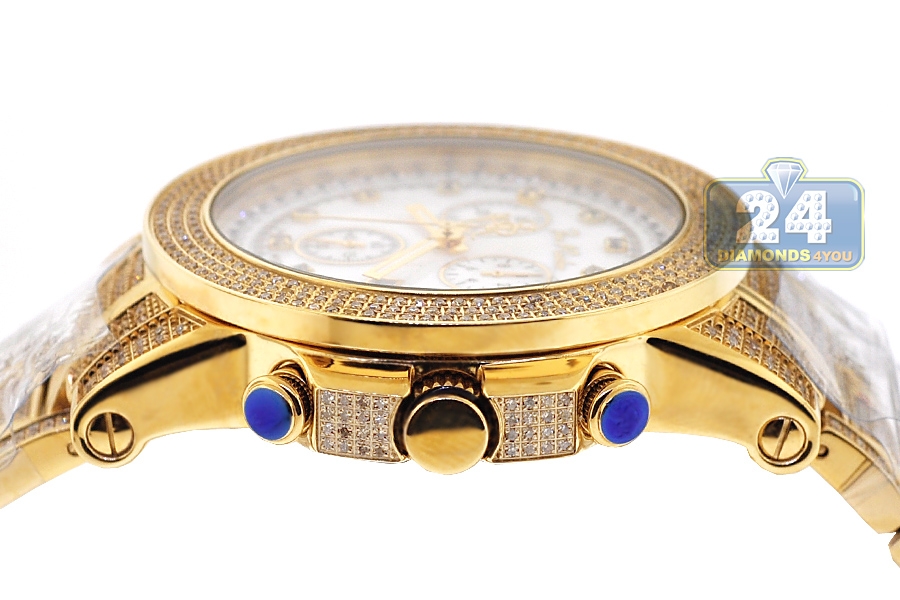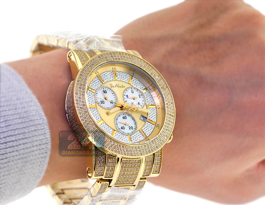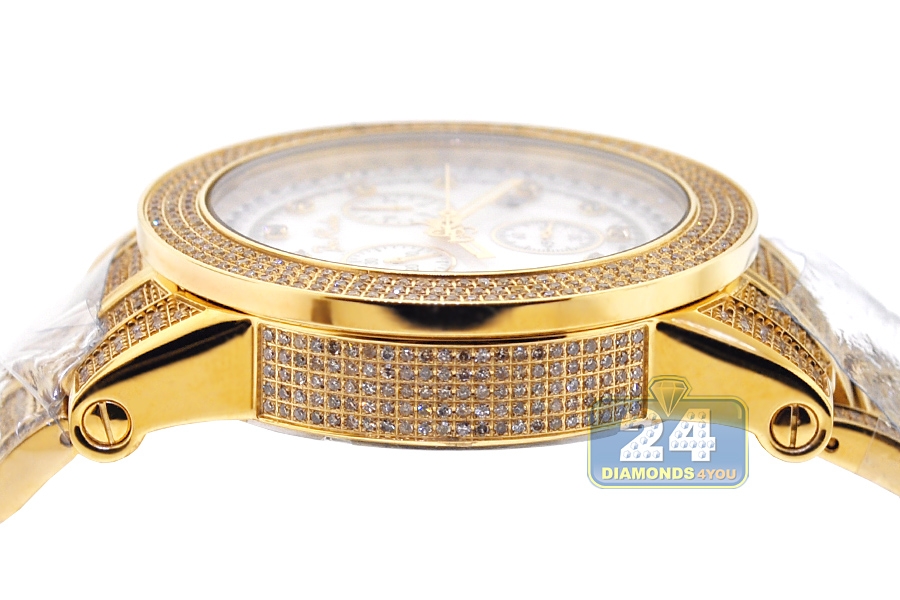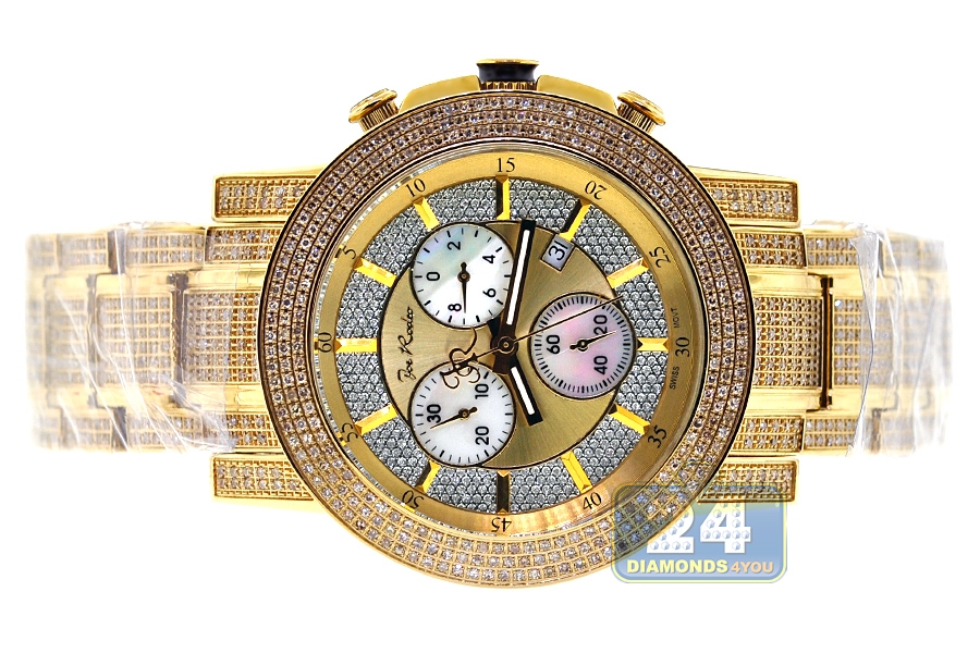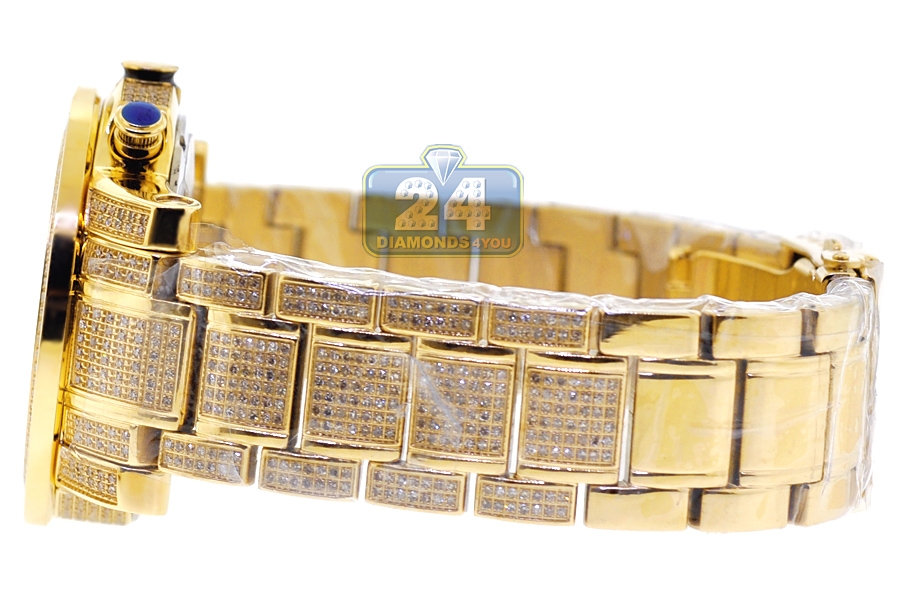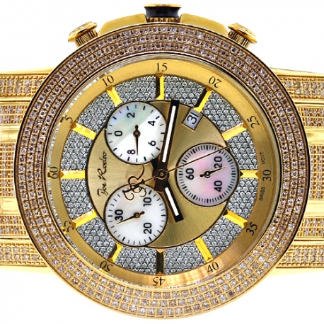 Get endless sparkle wearing this handsome men's diamond watch JTRO11 from Trooper collection designed by Joe Rodeo of New York. Its case and bracelet are created from durable stainless steel covered with long-lasting yellow gold plating. The case measures 48.0 mm in diameter, 14.5 mm in thickness; and the bracelet is 22 mm in width. The dial is colored in golden tone that protected by scratch resistant mineral crystal glass. It also features accurate Swiss quartz movement with chronograph and date functions. The timepiece is encrusted with 1140 natural white diamonds, approximately totaling 10.25 carats. Extra two bands of various colors are included.