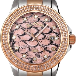 Lovely and fashionable lady's diamond watch JRZB3 from Zibra collection designed by Joe Rodeo of New York. Its case and band is made of stainless steel, and highly polished for shimmering finish. Its rose gold plated steel bezel is set with two rows of 116 genuine diamonds, all weighting 1.25 carat. Multicolor textured dial is protected by scratch resistant mineral crystal. It also comes with extra two straps of various colors. The timepiece features Swiss quartz movement with date function. Make a stylish statement!