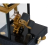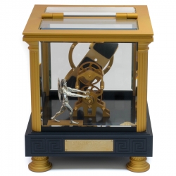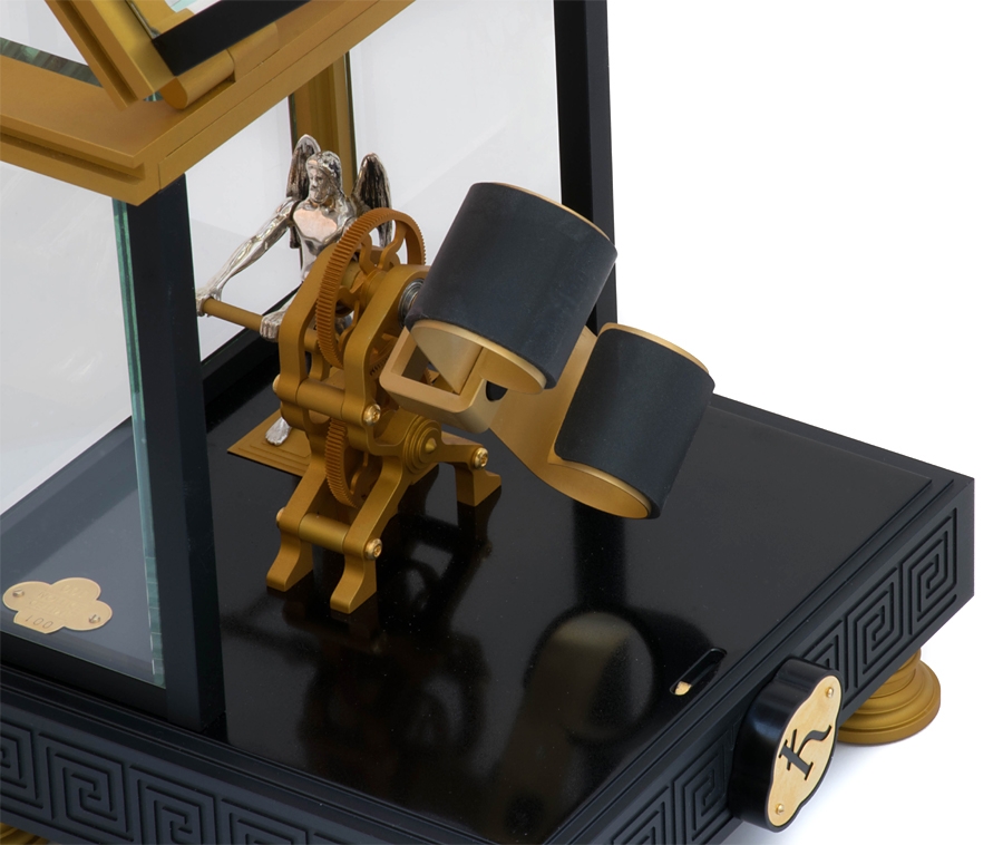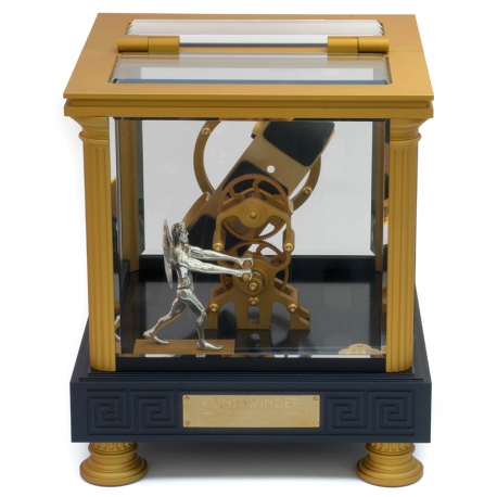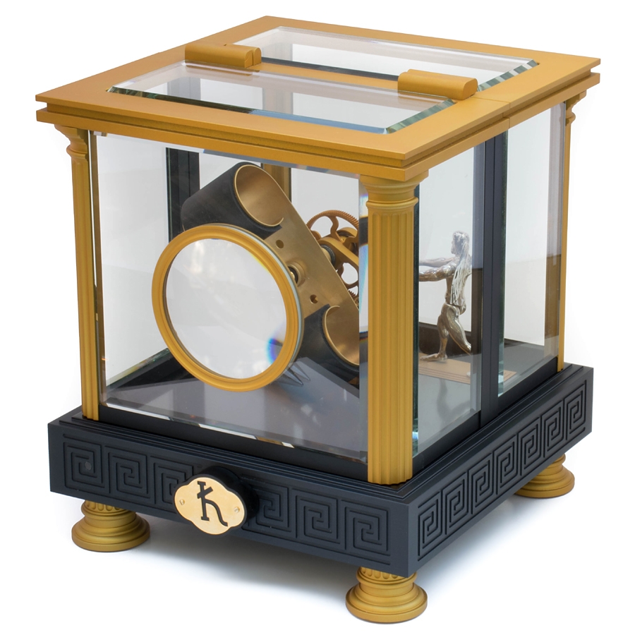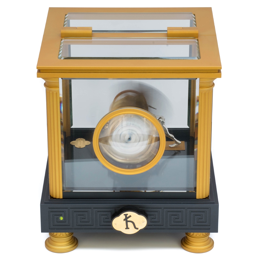 Enjoy Kunstwinder single watch winder, a member of unique Chronos collection, inspired by the Greek god of time and the leader of Titans. There is his figurine inside that is expertly crafted in solid silver. The man knows how to wind any automatic timepiece in a breathtaking way - his clear movement makes gold finished all-aluminum mechanism rotating. In the front there is a magnifying glass which shows the dial in details. The single winder is equipped with a precise, ultra-quiet, reliable, Swiss brushless gear motor which powered by a universal 90-260 VAC adaptor. The winding technology of Kunstwinder was granted US patent 8408784. The device features 24 pre-programmed modes. The knob located under the base is used to select a required program. The numbers in the small window show the current rotation rate in hundred-turns-per-day (HTPD). The maximum rate is 16, or 1600 turns-per-day. By toggling the switch under the base, you can also choose between 2 directions of rotation: single (amber LED) or alternate one (green LED). Single direction option rotates the automatic watch in one direction for 6 minutes, rests, and then rotates it for the same amount of time. Alternate mode rotates the timepiece in one direction for 3 minutes, rests, and then rotates it in the opposite direction for 3 minutes. The watch-mounting spring can be easily adjusted to fit any band size. It's also covered with protective rubber to avoid scratches. This Kunstwinder Chronos watch winder is numbered within a limited production series. When you shop at 24diamonds.com, you get a 3-year full warranty for this luxurious accessory.
