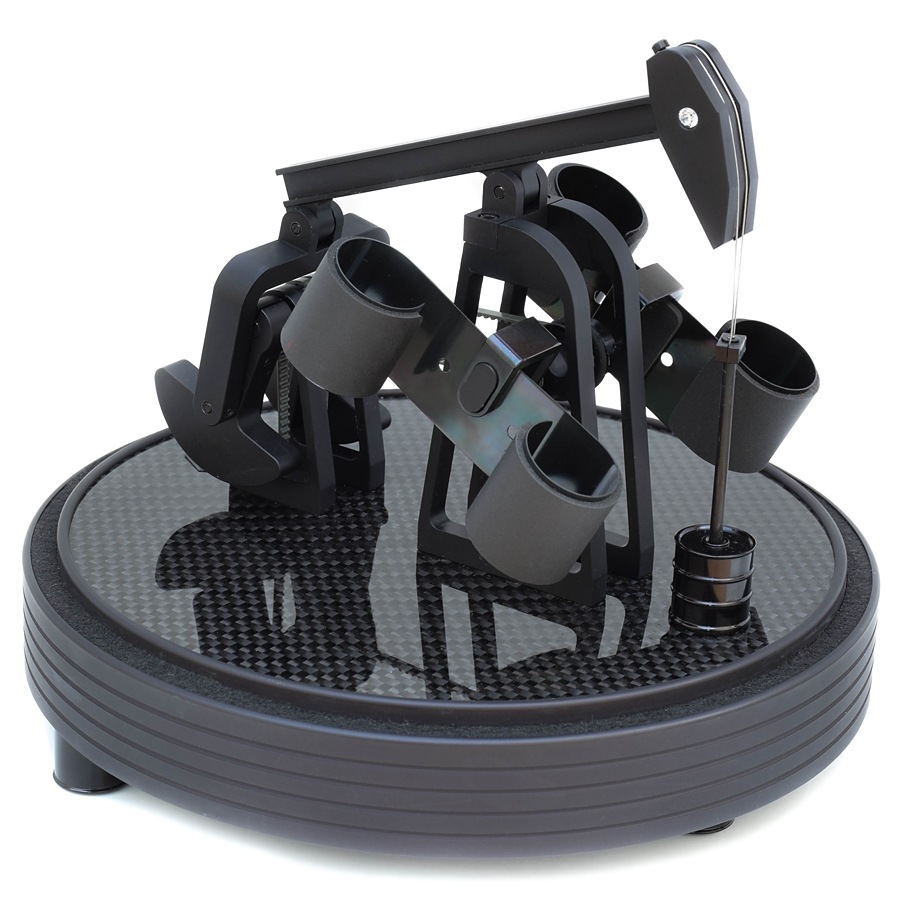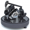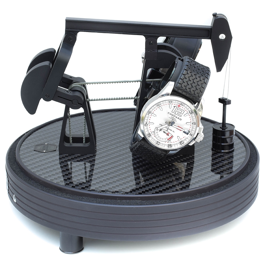 This Kunstwinder double watch winder is a member of famous Oil Baron collection, inspired by the work of the pump jack used in petroleum business to extract crude oil. The base features genuine carbon fiber material, and the mechanism has matte black finish. The automatic watch winder runs on precise, ultra-quiet, reliable, Swiss brushless gear motor which powered by a universal 90-260 VAC adaptor. The winding technology of Kunstwinder was granted US patent 8408784. The device offers 24 pre-programmed modes. The knob located under the base is used to select a required program. The numbers in the small window show the current rotation rate in hundred-turns-per-day (HTPD). The maximum rate is 16, or 1600 turns-per-day. By toggling the switch under the base, you can also choose between 2 directions of rotation: single (amber LED) or alternate one (green LED). Single direction option rotates the automatic watch in one direction for 6 minutes, rests, and then rotates it for the same amount of time. Alternate mode rotates the timepiece in one direction for 3 minutes, rests, and then rotates it in the opposite direction for 3 minutes. You need to consult the watch manufacturer before choosing the correct one. There are two watch-mounting springs that can be easily adjusted to fit any band size. They're also covered with protective rubber to avoid scratches. This Kunstwinder Oil Baron watch winder is numbered within a limited production series. When you buy at 24diamonds.com, it comes with a 3-year full warranty.