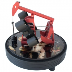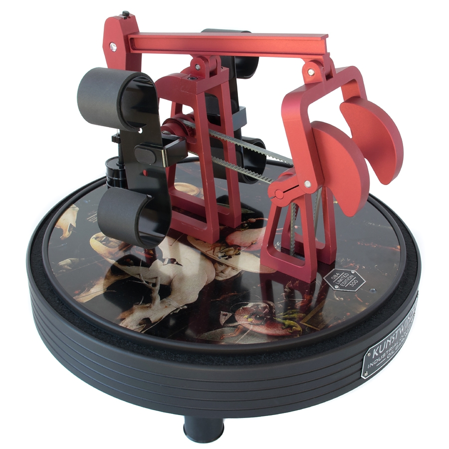 Both functional and artistic, this automatic watch winder by Kunstwinder brand is called "The Last Judgment", a member of Oil Baron Art collection, inspired by the work of the pump jack used in petroleum business to extract crude oil. This original model is a special edition created in honor of Hieronymous Bosch, a Dutch painter known for his unique imagery, accurate sceneries, illustrations of religious views and details. The dual watch winder features an exciting piece of his famous work "The Garden of Earthly Delights". In this purgatory scene, Bosch criticizes self-indulgence, lust, and over-consumption with musical instruments representing evil distraction and large ears symbolizing the deceptive lure of the senses. The illustration is impregnated into the porous aluminum oxide layer at the base using a proprietary process called anographics. The surface is then sealed in a special batch to close the pores in the layer, ensuring that the vibrant hues will never fade with time. The derrick mechanism is accurately produced from aluminum with exotic scarlet matte finish. This double watch winder has noiseless, reliable, Swiss brushless gear motor which powered by a universal 90-260 VAC adaptor. The device offers 24 pre-programmed winding modes. The knob located under the base is used to select a required program. The numbers in the small window show the current rotation rate in hundred-turns-per-day (HTPD). The maximum rate is 16, or 1600 turns-per-day. By toggling the switch under the base, you can also choose between 2 directions of rotation: single (amber LED) or alternate one (green LED). Single direction option rotates the automatic watch in one direction for 6 minutes, rests, and then rotates it for the same amount of time. Alternate mode rotates the timepiece in one direction for 3 minutes, rests, and then rotates it in the opposite direction for 3 minutes. You need to consult the watch manufacturer before choosing the correct one. There are two watch-mounting springs that can be easily adjusted to fit any band size. They're also covered with protective rubber to avoid scratches. This Kunstwinder Oil Baron watch winder is numbered within a limited production series. When you shop at 24diamonds.com, an official dealer of the brand, you get a 3-year full warranty.