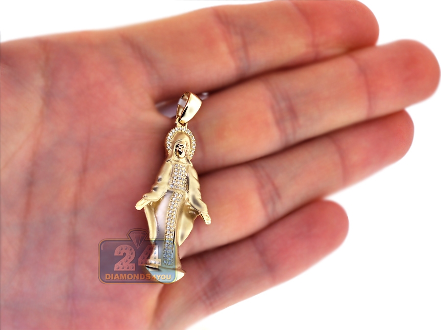 This diamond Virgin Mary pendant is a lovely expression of your faith! Elegantly created from warm 10 karat yellow gold, it has shiny polished and matte brushed finishes. The piece is accented with 0.25 carat of icy white round brilliant-cut natural diamonds, SI1-SI2 clarity and G-H color. Our men's religious pendant measures 46 mm in hanging length and 20 mm in width. Virgin Mary pendant will become one of your favorite pieces for years!
