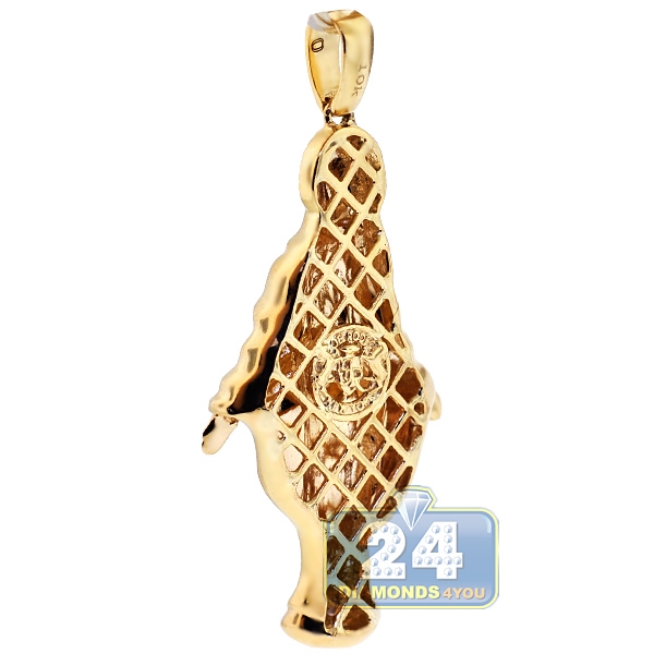 This Virgin Mary pendant is a lovely expression of your faith! It's expertly created from warm 10k yellow gold, and features beautiful matte finish. The religious pendant is accented with 0.40 carat of icy white round brilliant-cut genuine diamonds, SI1-SI2 clarity and G-H color. Our men's diamond pendant measures 65 mm in total height and 28 mm in width. The Virgin Mary statue charm is both elegant and inspirational!