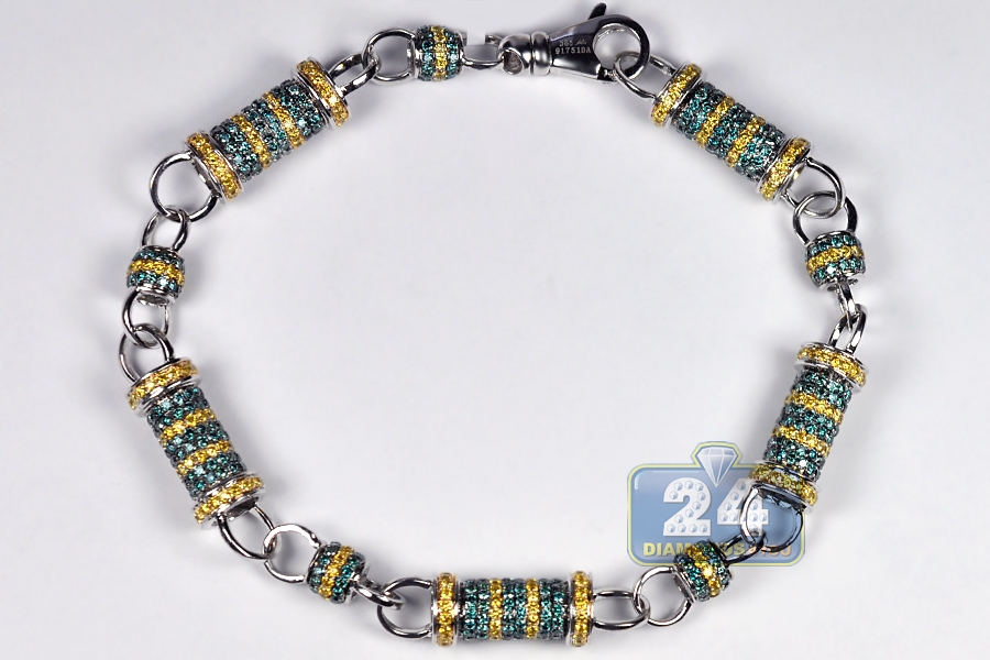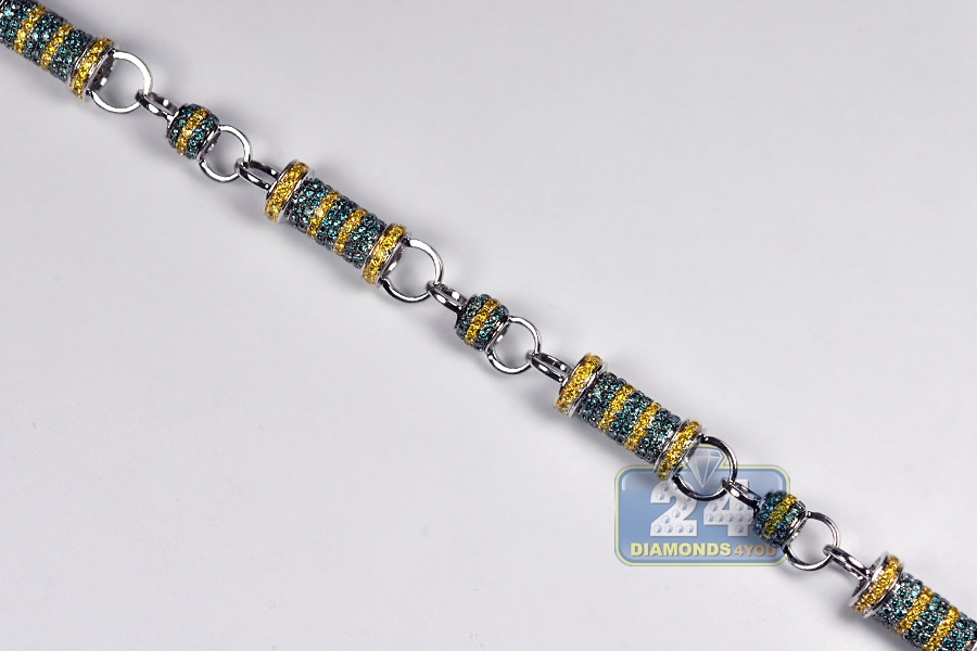 You will definitely bring some handsome charm to your look with our diamond bullet link bracelet! Gorgeously handmade of cool 14k white gold, it's studded with 8.63 carats of round brilliant-cut enhanced blue and enhanced yellow natural diamonds. The piece of jewelry measures 9.25 inches in length, 8 mm in width, and secured with the safest lobster claw closure. Follow your passion for fine jewelry with this men's wrist bracelet!