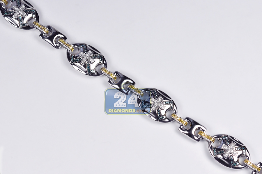 Our stylish diamond mariner link bracelet will command attention yet harmonize with many outfits! Artfully created from cool 14k white gold, it is encrusted with icy white, enhanced canary and enhanced blue natural diamonds, all totaling 1.60 carat. The piece measures 9 inches in length, 13 mm in width, and secured with a user-friendly lobster claw closure. This men's diamond bracelet is fabulous enough for any special occasion!