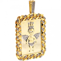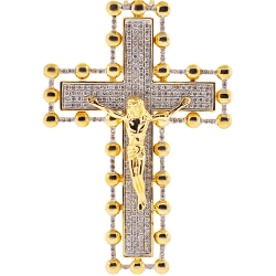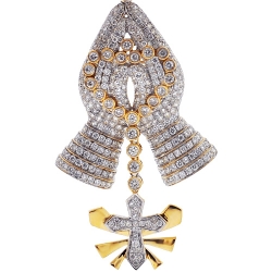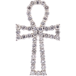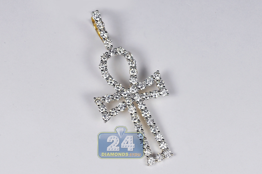 You can beautifully express your beliefs wearing our unique diamond ankh cross. Designed in open frame style, it's artfully crafted in warm 14k yellow gold, and high-polished adding extra shimmering look. It's studded with 3.29 carats of icy white round brilliant-cut genuine diamonds. The piece measures 51 mm in total length (38 mm without bail) and 22 mm in width. The bail is suitable for a 4 mm chain. This men's religious pendant catches the light with every turn!
