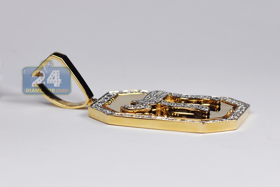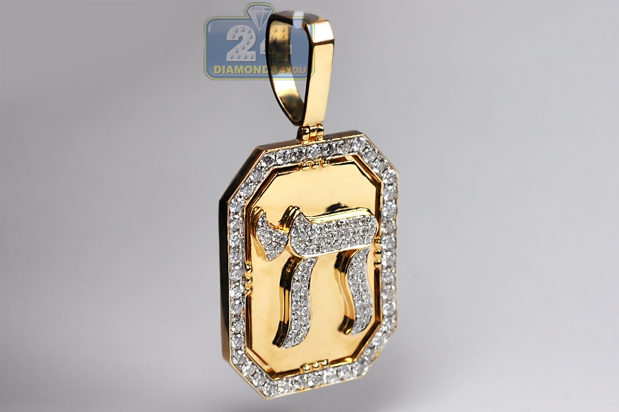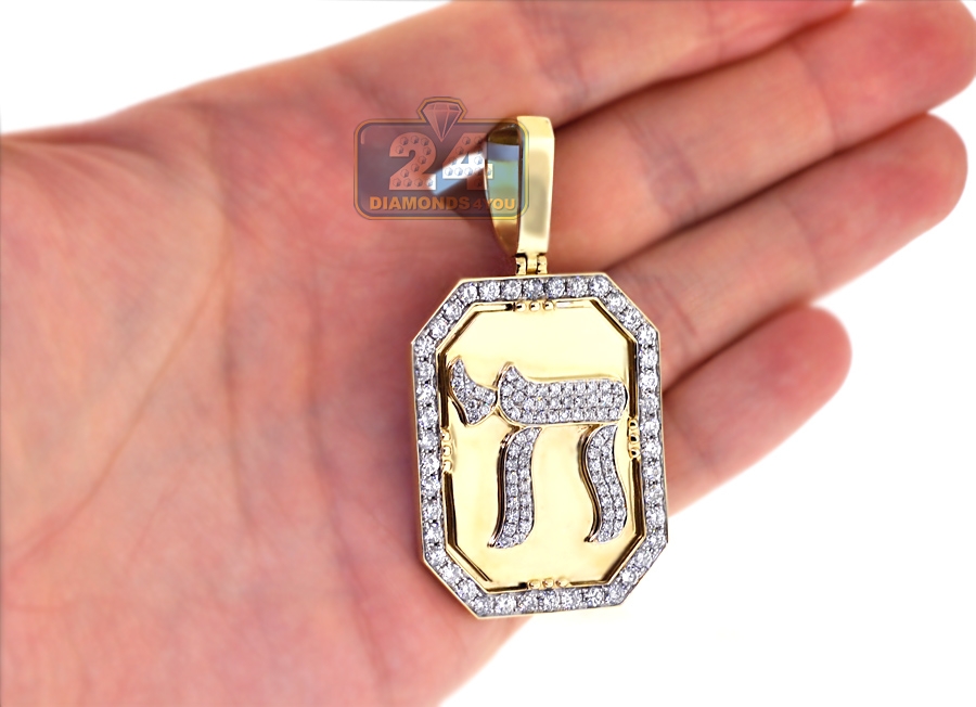 This diamond Chai medallion is a traditional symbol of life and good fortune! It is professionally produced from warm 14k yellow gold, and highly polished for sparkling smooth finish. The piece is amazed with 3.66 carats of icy white round brilliant-cut natural diamonds. It measures 32 mm in width, 43 mm in length and 62 mm including the bail. You're looking at men's religious pendant that makes a gorgeous representation of faith and culture!