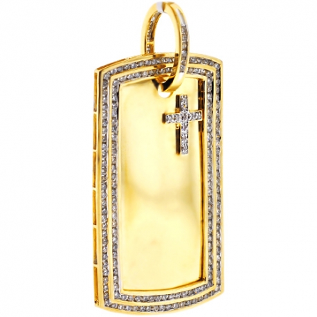 Personalize this men's stunning diamond dog tag ID pendant with words of your choice! Ably produced from warm 10k yellow gold, it is amazed with 3.03 carats of round brilliant-cut white diamonds. Our diamond pendant features total height of 67 mm, and tag itself is 56 x 32 mm. The bail can fit a necklace up to 8 mm in thickness. The diamond cross on the right upper corner adds a spiritual touch! Please note that if the item is engraved per your request, it cannot be returned.