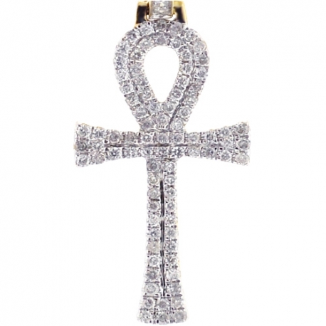 Our diamond ankh cross is a sleek symbol of faith that complements your everyday attire! Lovely crafted in affordable 10k yellow gold, it's highly polished for shiny smooth finish. It's also set with 0.46 carat of white round brilliant-cut natural diamonds. The piece features total length of 34 mm (without bail 24 mm) and width of 13 mm. The bail fits a chain of up to 5 mm. This men's small pendant can be a meaningful gift!