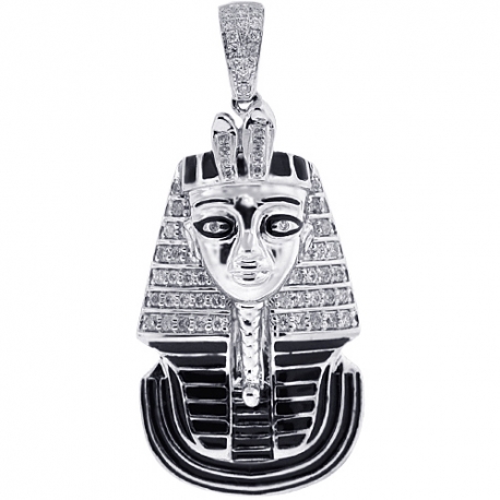 Add a powerful touch to your look with our magnificent diamond Egyptian pharaoh pendant! It is artfully crafted in cool 10k white gold that coated with black enamel, and accented with icy white round brilliant-cut genuine diamonds, all weighting 0.56 carat. This men's diamond pendant measures 47 mm in hanging length, and the figure is 39 x 22 mm. The diamond pharaoh pendant captivates with its original design!