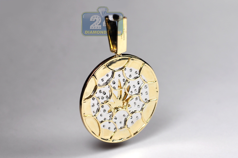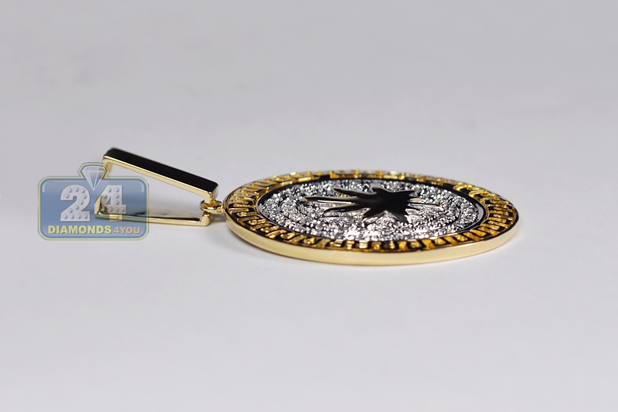 Give yourself a chic high wearing our handsome diamond marijuana leaf pendant! It features a medallion of round shape that has Greek key pattern frame. The piece is expertly produced from affordable 10k yellow gold with high-polished shiny finish. It's set with 0.88 carat of single-cut natural diamonds. There are also white rhodium accents that give even more brilliance. The medallion measures 50 mm in length and 35 mm in width. The bail can fit a necklace of maximum 4 mm. Showcase your favorite hobby with this men's cannabis charm!