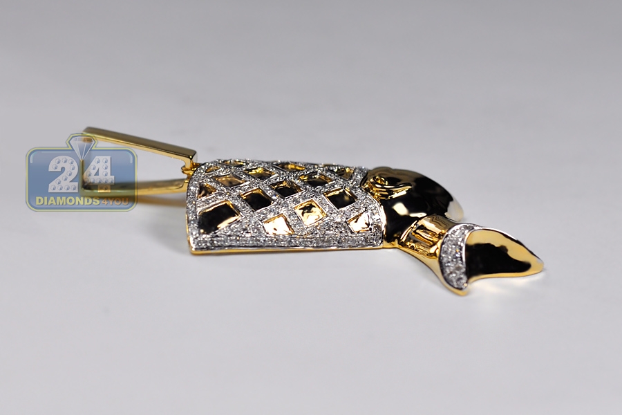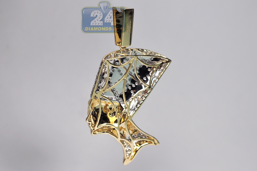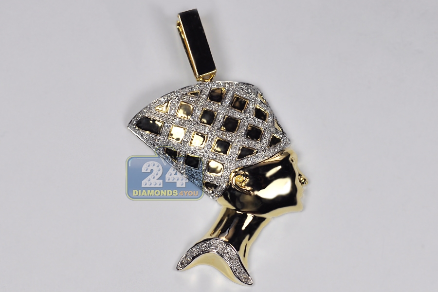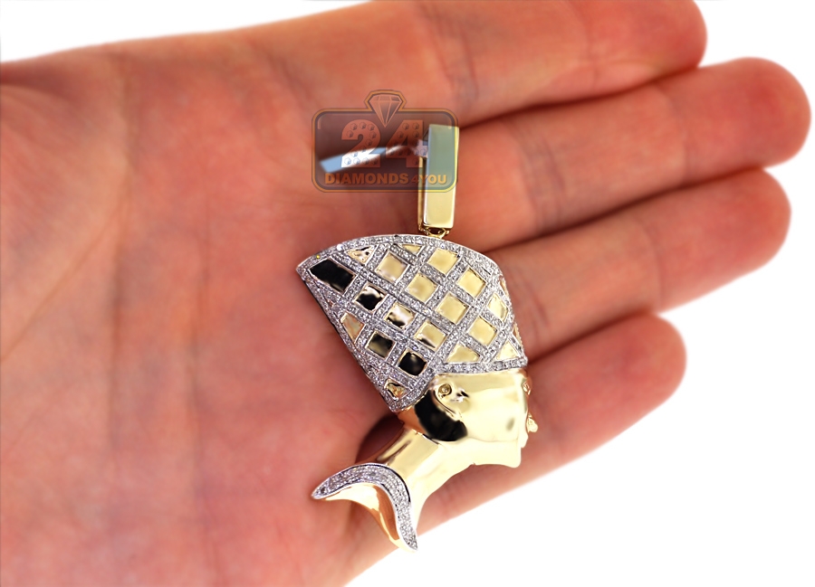 Our stunning diamond Nefertiti pendant features a depiction of pharaoh, one of the most powerful figures in history! It's artfully made of affordable 10k yellow gold, and has highly polished sparkling finish. It's also accented with white round single-cut natural diamonds weighting 0.70 carat. The piece features 58 mm in length (43 mm without bail) and 37 mm in width. The bail is suitable for a necklace of up to 4 mm. Show your appreciation of Egyptian history wearing this men's Nefertiti necklace!
