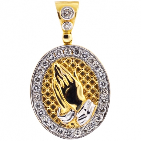 Our elegant diamond pendant is a classic symbol of faith that depicts hands raised in prayer! Masterly produced from hot 14k yellow gold, if has highly polished finish with white rhodium accents. The oval shaped pendant is set with 1.10 carat of icy white round brilliant-cut natural diamonds, SI1-SI2 clarity, G-H color. This men's diamond medallion measures 35 mm in dangling length, and the oval form is 24 x 21 mm. The piece of jewelry is designed to reveal your devout spirit!
