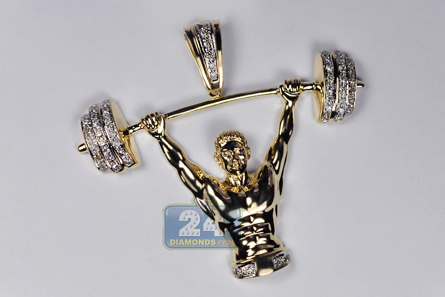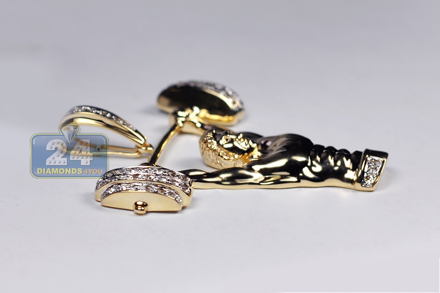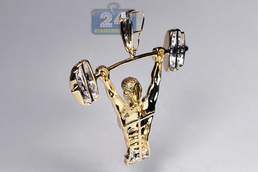 Our unique weight lifter athlete diamond pendant is designed to reveal your passion for sports! Gorgeously produced from affordable 10k yellow gold, it features high-polished smooth finish. There are also white rhodium accents that give even more shimmer. The piece is set with white round single-cut genuine diamonds totaling 0.85 carat. The diamond sport pendant measures 57 mm in hanging length, and the body is 41 x 65 mm. Be always the first with this men's weightlifting charm!