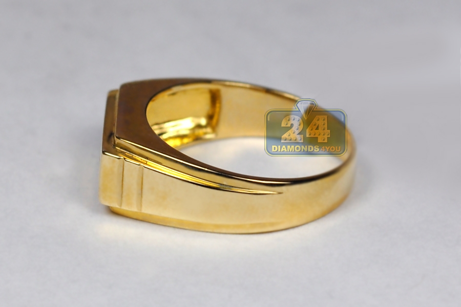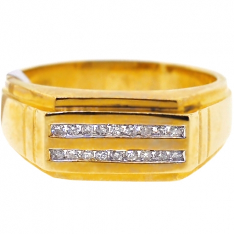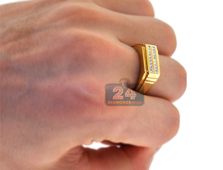 Get our handsome diamond signet as a symbol of commitment! It is masterly produced from lustrous 14k yellow gold with shiny finish, and channel-set with 2 rows of round brilliant-cut white diamonds. Light up your style wearing this men's magnificent ring!