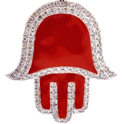 Type: Hamsa Hand of God PendantUPC: 072921474765 Metal: 10K Yellow Gold Finish: Polished, Red Enamel Diamond Weight: 0.80 carat Diamond Clarity: SI1-SI2 Diamond Color: G-H Diamond Shape: Round Brilliant Weight: 4.7 grams Total Length: 1 3/4 inches (44 mm) Size of Hand: 1 1/4 x 1 1/10 inches (32 x 28 mm)