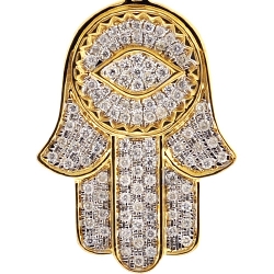 Type: Hamsa Hand with Evil Eye Pendant, Medium SizeUPC: 072921475199 Metal: 10K Yellow Gold Finish: Polished, White Rhodium Diamond Weight: 0.86 carat Diamond Clarity: I1-I2 Diamond Color: G-H Diamond Shape: Round Weight: 6.0 grams Total Length: 1 7/8 inches (47 mm) Size of Hand: 1 1/4 x 15/16 inches (32 x 24 mm)