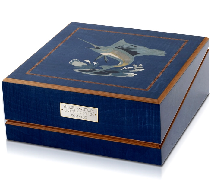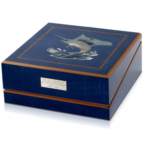 Orbita W20052 is triple automatic watch winder from Artisan collection. This luxurious box is ably created from the highest quality wood with high-gloss lacquered finish by Giglio, Italian company. It is also covered with rich black suede leather inside. Giuseppe Miniero, famous artist, professionally depicted a piece of art called "Blue Marlin". The winder uses patented rotorwind winding technology that ideally mimics the natural movement of the wrist. And it is totally wireless, powered by long-lasting lithium batteries. This unit is released in limited edition of 100 pieces. Each is numbered and signed by the artist. Buy online at 24diamonds.com, official dealer of Orbita brand, and you will get 1-year factory warranty as well as professional after-warranty service for every watch accessory.