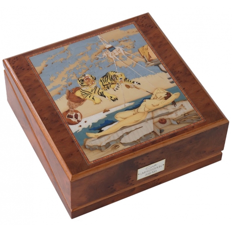 Orbita W20051 is triple automatic watch winder from Artisan collection. This luxurious box is masterly handmade of the highest quality wood with high-gloss lacquered finish by Giglio, Italian company. It is also covered with rich black suede leather inside. Giuseppe Miniero, famous artist, professionally depicted Salvador Dali's piece of art "Dream caused by the flight of a bee around a pomegranate a second before awakening". The winder uses patented rotorwind winding technology that ideally mimics the natural movement of the wrist. And it is totally wireless, powered by long-lasting lithium batteries. This unit is released in limited edition of 100 pieces. Each is numbered and signed by the artist. Buy online at 24diamonds.com, official dealer of Orbita brand, and you will get 1-year factory warranty as well as professional after-warranty service for every watch accessory.