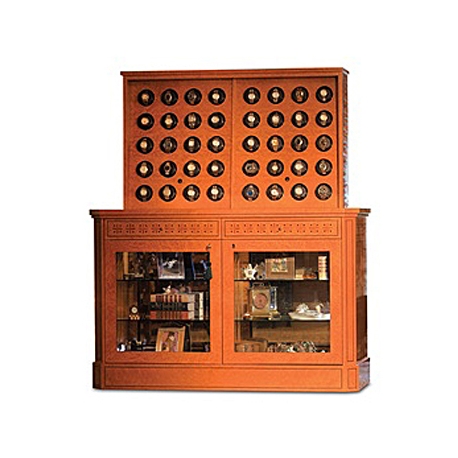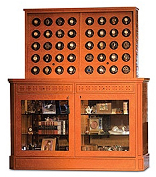Orbita W60034 is winder cabinet crafted in madrona burl, and designed for forty automatic timepieces. Watch enthusiasts now have a choice. They can keep up to 40 watches fully wound, either on display or completely hidden from view. The attractive Italian-made inlaid and veneered cabinet houses a remote controlled motorized lift mechanism that raises or lowers the watchwinder module on command. A keyed security lock is also provided to prevent the winder from being accessed by unauthorized persons. When in the lowered position, both the watches and the watchwinder mechanism are totally concealed and the casual observer only sees a beautifully detailed piece of furniture. Even when the front doors are opened, while the storage area is exposed there is no hint of the watches stored behind as they are concealed behind a false mirrored panel. Two waist-level, ball-bearing mounted storage drawers are also provided for paperwork and personal items. Access to all internal mechanisms is from the front of the cabinet. Forty Swiss-designed ironless core motors power the 40 winding stations. Unlike other watchwinder manufacturers who utilize a single motor to drive two, three or even four watches together, Orbita winders are built with each drive station being fitted with its own motor and controlled by its own microprocessor. Consequently, each watch station can be individually programmed for the winding requirements of a specific watch with specific settings for turns per day, winding direction and auto reversing (if required). On the Orbita Bergamo 40 watch winder, each station is easily programmed from the front of the cabinet by simply removing a mounting cup and setting the 4 pole DIP switch mounted behind it. Also easily accessible is an on/off control switch for each individual station. The electrically powered lift mechanism has been designed to provide long, trouble-free operation. The lift action can be actuated with a wireless remote transmitter or by an easily accessible manual switch. Locking the remote control in the storage area. The front door locks disable the lift while power is maintained to the winder motors. This feature prevents passersby from operating the unit without permission. A hinged arrangement on the top panels of the winder provides safety breakaway protection in the event that inquisitive fingers are not withdrawn as the lift unit descends into the closed position. Owners of fine automatic watches can be confident that their watches will remain fully wound, ready to wear and properly exercised without any concerns about over-winding. All of the operating components are plug and play and in the unlikely event of component failure, each and every component is easily replaced in the field with nothing more than a screwdriver.
