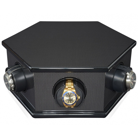 W21400 is six automatic watch winder from Carolo collection, produced by Orbita Corporation in USA. The hexagonal case is made of carbon fiber panels, and mounted on a ball-bearing swivel what allows the unit to be rotated by hand. It uses patented rotorwind winding technology that ideally mimics the natural movement of the wrist. That can be described as a series of oscillations triggered by a single revolution every 10 or 15 minutes. Each winder head has its own power and programming switches. So they can be turned off individually when not in use. This box is powered by six high-energy lithium batteries. Buy online at 24diamonds.com, official dealer of Orbita brand, and you will get 1-year factory warranty as well as professional after-warranty service for every watch accessory.