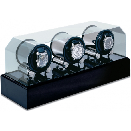 W34004 is triple automatic watch winder, a part of Futura series, manufactured by Orbita Corporation. It has high-gloss lacquered wood finish base and acrylic lid dust cover. This triple winder features programmable winding technology that is controlled by a sophisticated microprocessor. It allows to switch between 650, 800, 950 or 1300 turns per day, with a choice of clockwise, counter-clockwise or automatic reversing rotations. The unit is powered by supplied AC adapter or alkaline batteries (not included). Please check other triple watch winders.