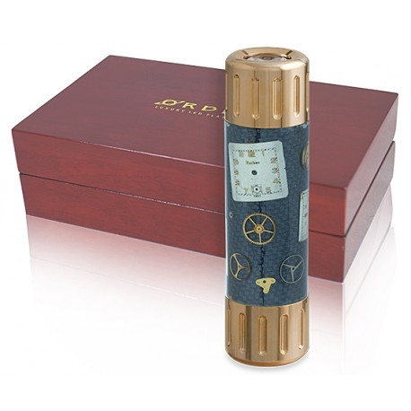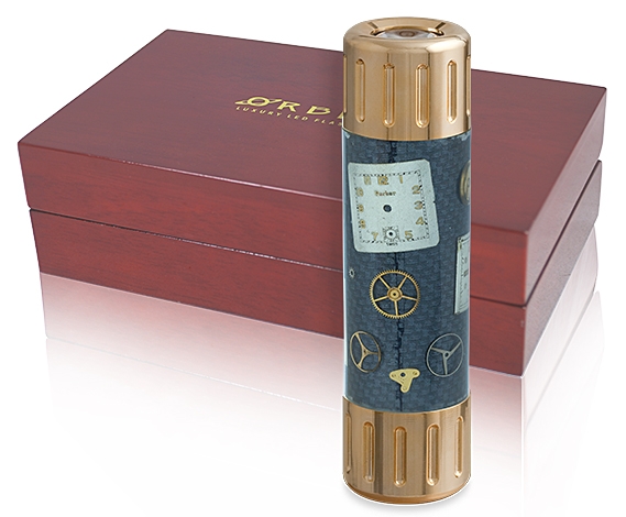 Orbita Flashlight F20122 is new series of multi-functional luxury illumination tools, powered by a high-energy rechargeable Lithium-Ion battery, delivers an unprecedented level of intense white light. What is unique is that embedded in the clear Polyester body of this carbon fiber and stainless steel flashlight is a collection of actual watch parts; dials, gears, bridges and balance wheels. Each one of these hand made lights is different and individually unique. The LED powered Flashlight has five user selectable lighting programs: High Beam, Medium Beam, Low Beam, Defense Strobe and S.O.S. Signal. Dust proof and splash proof to IP54 standard.
