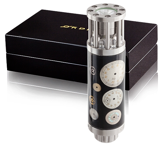 Orbita Flashlight F10121 is new series of multi-functional luxury illumination tools, powered by a high-energy rechargeable Lithium-Ion battery, delivers an unprecedented level of intense white light. Embedded in the clear Polyester body of this carbon fiber and stainless steel flashlight is a collection of actual watch parts, dials, gears, bridges and balance wheels. Each one of these hand made lights is different and individually unique. The LED powered WATCHLIGHT™ have six user selectable lighting programs: High Beam, Low Beam, Defense Strobe, S.O.S. Signal, Lantern Mode and Beacon Mode. By double clicking the power button, you can scroll through and select any one of the modes of operation. Turn power on or off in any selected mode with a single click. A handy lantern base is included to stand the flashlight upright. Dust proof and splash proof to IP54 standard.