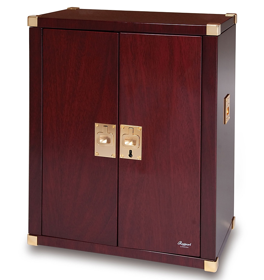 Complete luxurious winding and storage solution comes in this quad automatic watch winder W284, a member of Optima Captain's series designed by Rapport London. The cabinet is made of mahogany wood with high-gloss lacquer finish. It also features corner protection details, foldaway holders, hinged lid and lock made of gold plated brass. For chic touch, the interior is lined with soft beige velvet. There is internal lighting that beautifully illuminates your valuable pieces. You will also find two pull out compartment drawers for extra 4 timepieces, jewelry and some small accessories. Four watch holders are covered with black leather, and have adjustable soft clips that accommodate any watch sizes. Winding mechanism works very quietly. It offers 2 speed rotation options (1130-1690 or 3960 turns per day) as well as 3 direction rotation modes (clockwise, counter-clockwise or bi-directional). The program can be set individually for each timepiece. This unit can be powered by AC adapter or batteries. It measures 17.7 inches in width, 13.4 inches in height and 7.3 inches in depth. If you choose this winding chest, you will keep your automatic watches ticking accurately! We are an official dealer of the brand. So you get factory warranty and free domestic shipping for this item.