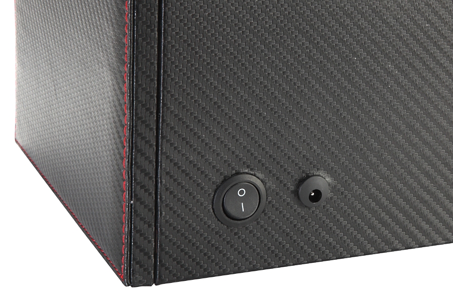This quad watch winder 34-704 by Diplomat Modena is designed to wind four automatic watches, and safely store up to sixteen timepieces. The exterior finish features an exotic carbon fiber pattern with rich red accents. The interior is also lined with synthetic carbon fiber patterns. This winder unit features Japanese Mabuchi motors that have 4 programmed settings which allow you to rotate your watch at a designated number of turns per day (TPD) and rotation direction. First setting rotates in a clockwise direction for 1 minute, then rests for 20 minutes, and then repeats (650TPD). Second setting rotates in a counter-clockwise direction for 2 minutes, then rests for 28 minutes, and then repeats (900TPD). Third setting rotates in a counter-clockwise direction for 3 minutes, then rests for 27 minutes, then rotates clockwise for 3 minutes and rests for 27 minutes, and then repeats (1350TPD). Fourth setting rotates in a clockwise direction for 10 minutes, then 10 minutes in counter-clockwise, repeating this program for 1 hour, then rests for 7 hours, and then repeats from the beginning (1800TPD). The box is powered by supplied 3V AC adapter. The holder in the winder section can accommodate a watch face as wide as 68 mm. There is a storage compartment on the top where you can keep sixteen your favorite watches. Each section measures 53 mm in width and 85 mm in length. Watch cushions are very soft and can also be compressed to accommodate different case sizes. The unit can be locked using the supplied key. It also comes with original manufacturer warranty of 1 year.