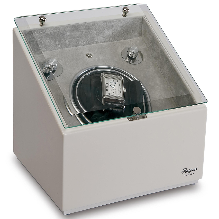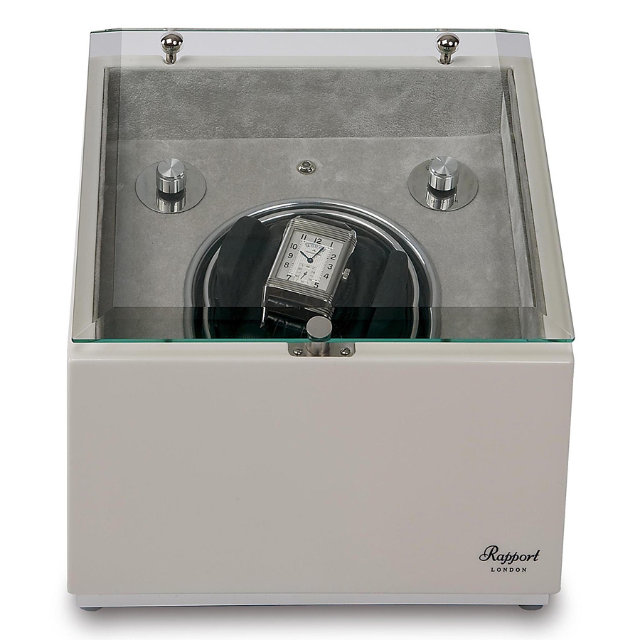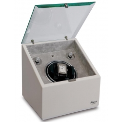 With precision winding system and contemporary elegant design, this single watch winder W150 is a part of Astro collection manufactured by Rapport London brand. It's finely made of solid wood with eight layers of high-gloss white lacquer. And the interior is lined with soft-feel gray velvet fabric. It's fitted with a thick glass lid with wide beveled edges to showcase your timepiece in a gorgeous way. The watch holder is covered with black leather, and has adjustable soft clip that accommodates any length of watch band. This device is equipped with a reliable motor that is completely programmable and runs virtually silent. There are control knobs that offer to select between 2 speed rotation options (3960 or 1130-1690 turns per day) and 3 rotation directions (clockwise, counter-clockwise or bi-directional). It's powered with AC adapter or four C-type batteries. The case measures 7.5 inches in width, 7.5 mm in height and 6.25 inches in depth. We're an official dealer of the brand. You get factory warranty and free domestic shipping for this item.