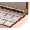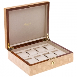 Give your valuable timepieces a proper home, use this eight watch storage box L406, a member of Heritage collection produced by Rapport of London in United Kingdom. It's expertly crafted in solid wood with high-gloss lacquered bamboo style pattern finish. The interior features 8 individual compartments that lined with soft beige suede material. There are removable padded cushions to keep your valuable watches protected. The case is accented with gold plated hardware, and can be locked with a supplied key. It measures width of 11 4/5 inches, depth of 10 inches and height of 3 1/2 inches. This is a right choice if you're looking for the highest quality. We are an official dealer of the brand. You'll get factory warranty and free domestic shipping for this item.