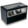 This double automatic watch winder W262 will ensure your timepieces always maintain their precision! It comes from well-known Optima collection produced by Rapport of London in United Kingdom. The case is artfully crafted in fine ebony wood with high-gloss lacquered finish. It's fitted with beveled thick glass windows elegantly framed in aluminum. The interior is lined with soft-feel gray velvet material. The watch holder is covered with black leather, and has adjustable soft clip that accommodates any length of watch band. This device is equipped with reliable motors that are completely programmable, and run virtually silent. There are control switches that offer to select between 2 speed rotation options (3960 or 1130-1690 turns per day) and 3 rotation directions (clockwise, counter-clockwise or bi-directional). It's powered with AC adapter or batteries. The box features height of 7 1/2 inches, width of 12 inches and depth of 6 1/4 inches. This is a chic example of cabinetmaker's art! We're an official dealer of the brand. You get factory warranty and free domestic shipping for this item.