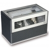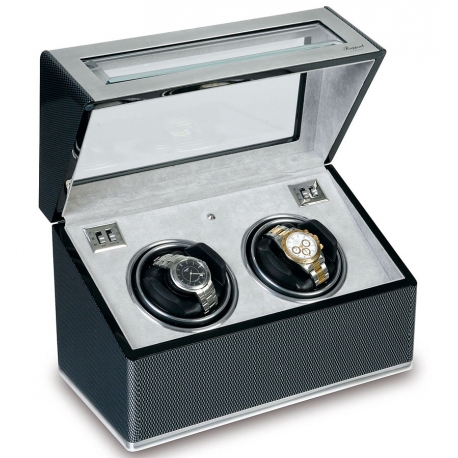 Two favorite automatic timepieces will be ready to go when you need them with double watch winder W252, a part of Optima F3 collection manufactured by Rapport of London in United Kingdom. The box is expertly crafted in fine wood with high-gloss lacquered carbon fiber finish. It's fitted with beveled thick glass windows elegantly framed in aluminum. The interior is lined with soft-feel gray velvet material. The watch holder is covered with black leather, and has adjustable soft clip that accommodates any length of watch band. This device is equipped with reliable motors that are completely programmable, and run virtually silent. There are control switches that offer to select between 2 speed rotation options (3960 or 1130-1690 turns per day) and 3 rotation directions (clockwise, counter-clockwise or bi-directional). It's powered with AC adapter or batteries. The case has the following measurements: height of 7 1/2 inches, width of 12 inches and depth of 6 1/4 inches. This dual winding device ensures your automatic mechanical watches keep perfect time! We're an official dealer of the brand. You get factory warranty and free domestic shipping for this item.