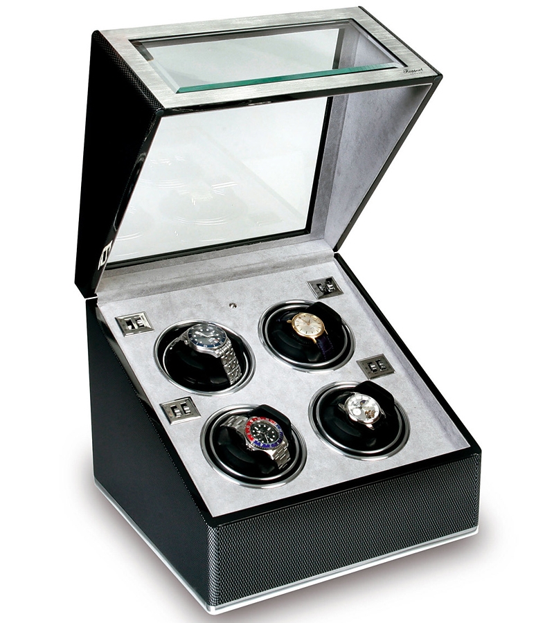 This quad watch winder W254 has a variety of settings to ensure every automatic timepiece of your collection keeps perfect time! It's a member of Optima F3 series manufactured by Rapport of London in United Kingdom. The box is professionally created from fine wood with high-gloss lacquered carbon fiber finish. It's fitted with beveled thick glass windows elegantly framed in aluminum. The interior is lined with soft-feel gray velvet material. The watch holder is covered with black leather, and has adjustable soft clip that accommodates any length of watch band. This device is equipped with reliable motors that are completely programmable, and run virtually silent. There are control switches that offer to select between 2 speed rotation options (3960 or 1130-1690 turns per day) and 3 rotation directions (clockwise, counter-clockwise or bi-directional). It's powered with AC adapter or batteries. The case has the following measurements: height of 10 inches, width of 12 inches and depth of 11 1/4 inches. This winding device will make your mechanical watches running smoothly! We're an official dealer of the brand. You get factory warranty and free domestic shipping for this item.