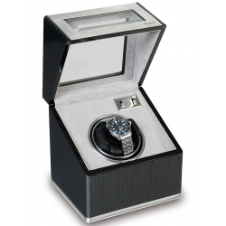 This single watch winder W251 is a must-have accessory for the owner of quality timepieces! It's a member of Optima F3 series manufactured by Rapport of London in United Kingdom. The box is masterly made of fine wood with high-gloss lacquered carbon fiber finish. It's fitted with beveled thick glass windows elegantly framed in aluminum. The interior is lined with soft-feel gray velvet material. The watch holder is covered with black leather, and has adjustable soft clip that accommodates any length of watch band. This device is equipped with a reliable motor that is completely programmable, and runs virtually silent. There are control switches that offer to select between 2 speed rotation options (3960 or 1130-1690 turns per day) and 3 rotation directions (clockwise, counter-clockwise or bi-directional). It's powered with AC adapter or batteries. The case has the following measurements: height of 7 1/2 inches, width of 7 1/2 inches and depth of 6 1/4 inches. This winding device ensures your automatic mechanical watch keeps perfect time! We're an official dealer of the brand. You get factory warranty and free domestic shipping for this item.