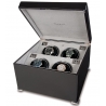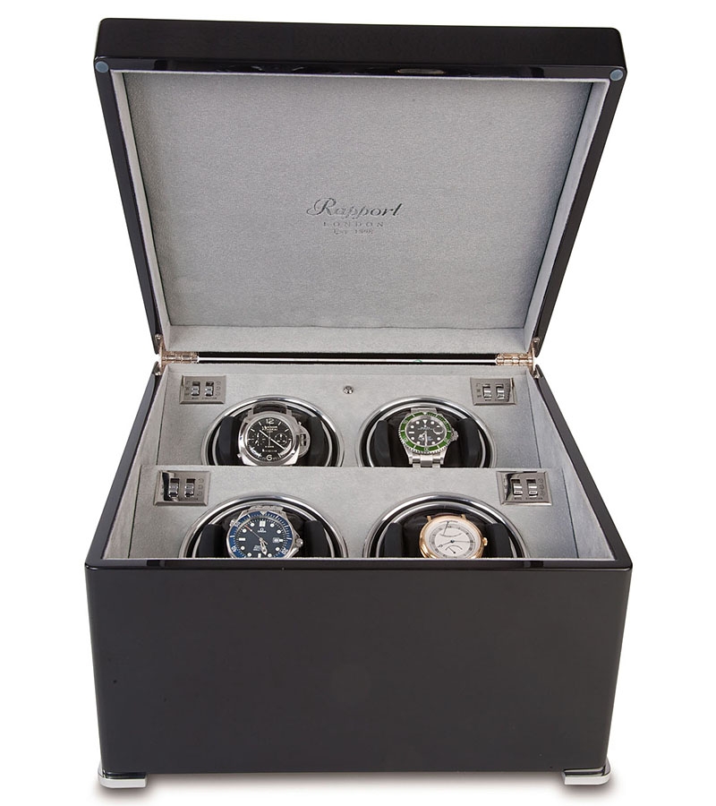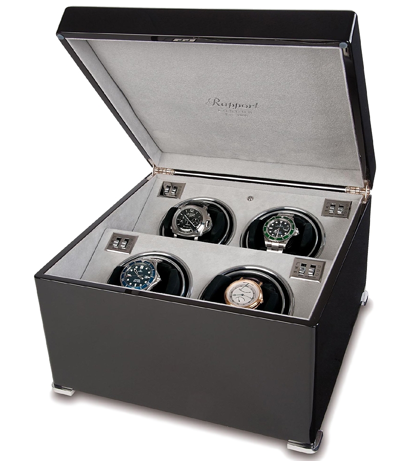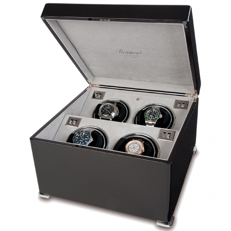 A perfect companion to help keep your lovely timepieces wound and set is presented by this quad automatic watch winder W124, a member of updated Perpetua II collection created by Rapport London. The box is artfully crafted in ebony wood with high-gloss piano finish; and interior is lined with soft gray velvet fabric. It also has chrome plated brass corner feet. Watch holders are covered with black leather, and have an adjustable soft clip that accommodates any length of watch band. Motor mechanism works very quietly. It offers multiple winding programs including 2 speed rotation options (1130-1690 or 3960 turns per day) as well as 3 direction rotation modes (clockwise, counter-clockwise or bi-directional). This unit can be powered by AC adapter or batteries. It measures 12 1/4 inches in width, 7 1/2 inches in height and 12 1/4 inches in depth. Using this winding box, you won't let your automatic watches stop! We are an official dealer of the brand. So you get factory warranty and free domestic shipping for this item.