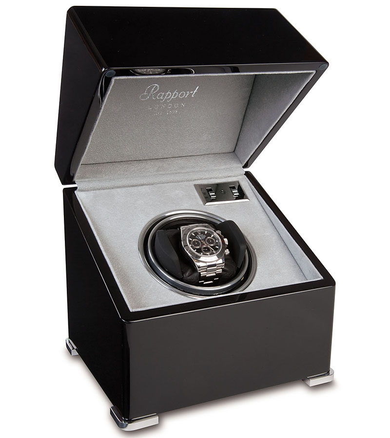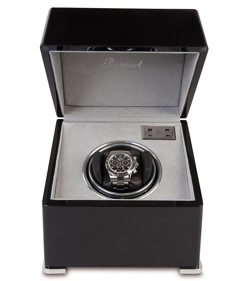 Luxurious silky smooth appearance and reliable efficiency are combined in single automatic watch winder W121, a part of updated Perpetua II collection produced by Rapport London. The box is finely made of ebony wood with high-gloss piano finish; and interior is covered with soft gray velvet fabric. It also has chrome plated brass corner feet. The watch holder is lined with black leather, and has an adjustable soft clip that accommodates any length of watch band. Motor mechanism works very quietly. It offers multiple winding programs including 2 speed rotation options (1130-1690 or 3960 turns per day) as well as 3 direction rotation modes (clockwise, counter-clockwise or bi-directional). This unit can be powered by AC adapter or batteries. It measures 7 3/4 inches in width, 7 1/2 inches in height and 6 3/4 inches in depth. Using this winding box, you won't let your automatic watch stop! We are an official dealer of the brand. So you get factory warranty and free domestic shipping for this item.