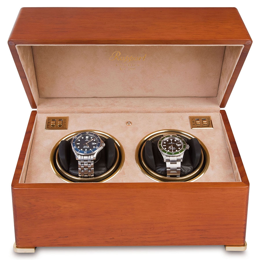 A perfect functional device for the most discerning customer, this double automatic watch winder W112 comes from updated Perpetua II series designed by Rapport London. The box is artfully crafted in wood with walnut veneer finish covered with several layers of lacquer; and interior is lined with soft beige velvet fabric. It also has gold plated brass corner feet. Watch holders are covered with black leather, and have an adjustable soft clip that accommodates any length of watch band. Motor mechanism works very quietly. It offers multiple winding programs including 2 speed rotation options (1130-1690 or 3960 turns per day) as well as 3 direction rotation modes (clockwise, counter-clockwise or bi-directional). This unit can be powered by AC adapter or batteries. It measures 12 1/4 inches in width, 7 1/2 inches in height and 6 3/4 inches in depth. Using this winding box, you won't let your automatic watches stop! We are an official dealer of the brand. So you get factory warranty and free domestic shipping for this item.