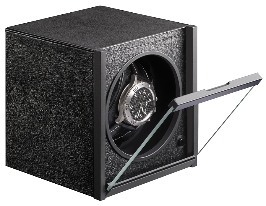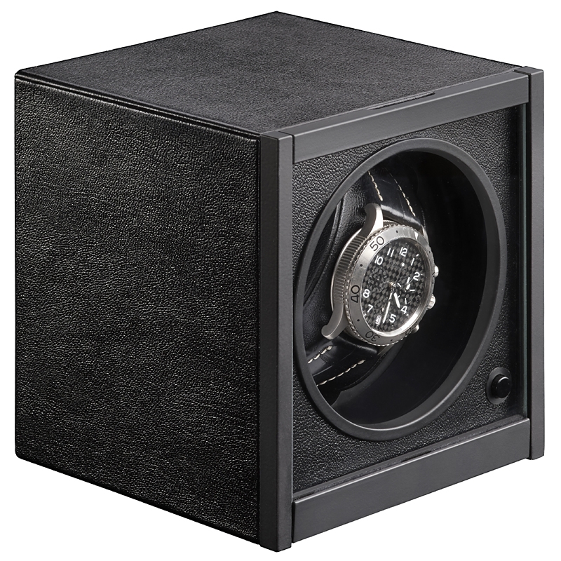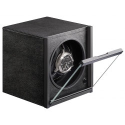 Stylish minimalistic design and latest winding technology go together in this single automatic watch winder, a part of Horizon collection created by RDI Charles Kaeser in Switzerland. The lightweight box features fine black leather exterior with matching leather interior; and flip-down protective glass door. The device is equipped with ultra-silent motor that makes 1000 revolutions per 24 hours in clockwise and counter-clockwise directions. It is powered by two C-type batteries and optional power adapter (not included). This practical rotating box is ideal to keep in safes, to take when travelling, and in fact absolutely anywhere! We're an authorized dealer of the brand. You will get official factory warranty and free domestic shipping for this item.