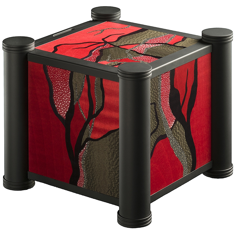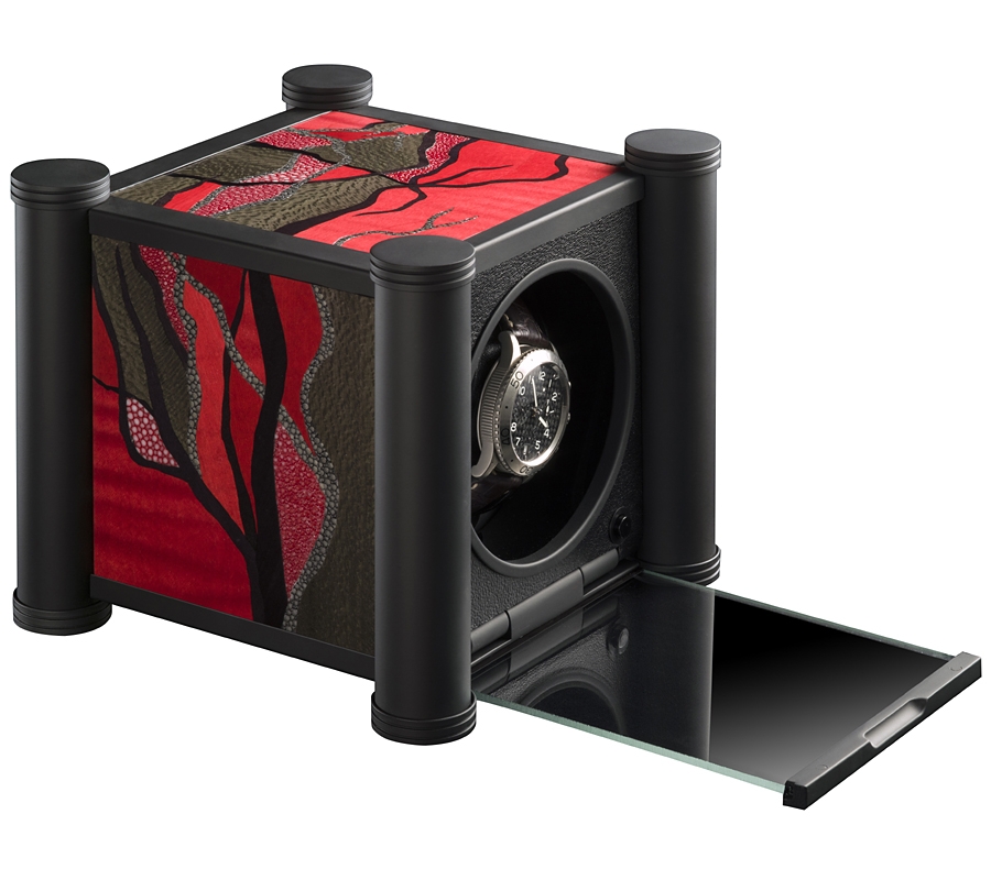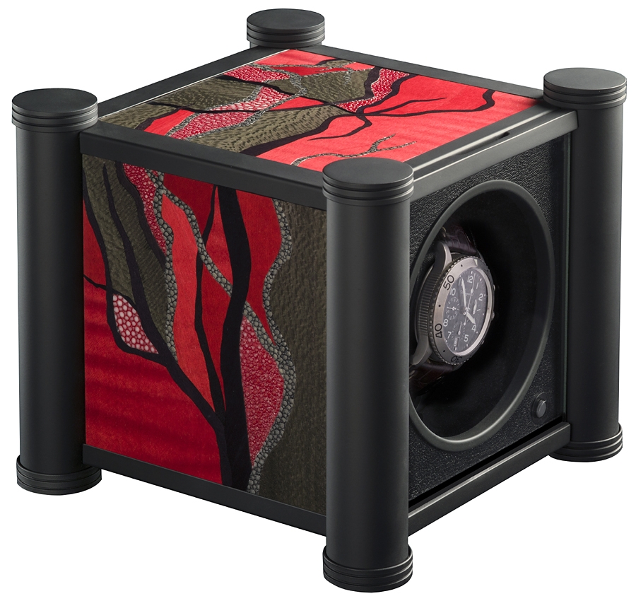 The Vegetal combines beauty of nature and artful technology! This single automatic watch winder is limited edition, individually numbered member of Signature collection handmade by RDI Charles Kaeser in Switzerland. Its case shows outstanding talent of Parisian artist Rose Saneuil. Its design is encouraged by sycamore leaves that flows throughout the chassis with plane tree wood, red scaled shagreen, stingray black and grey exotic leathers. It's also amazed with four matte black columns. The interior features black grained leather panel with transparent glass door. The watch holder comes with two various cushions to fit both men's and women's timepieces. The box is quipped with ultra-silent motor that offers 16 winding programs: from 420 to 1400 turns per day in clockwise and counter-clockwise directions. It can be powered by two AA-type batteries as well as power adapter. This unique composition encases state-of-the-art technology for reliability and performance. We're an authorized dealer of the brand. You will get official factory warranty and free domestic shipping for this item.