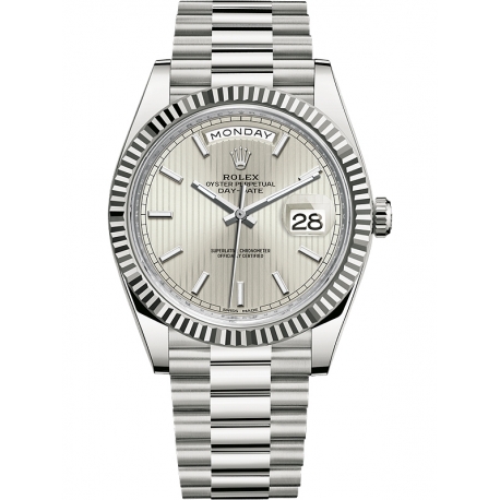 Rolex Day-Date 40 mm 18K White Gold Stripe Motif Silver Dial President Bracelet Watch - Reference 228239-0001 / 228239SSP