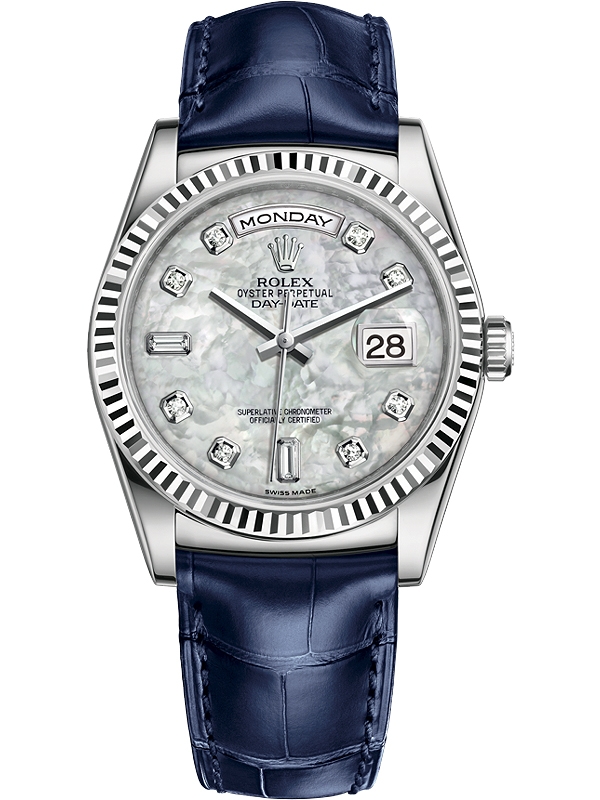 Rolex Oyster Day-Date 36 mm 18K White Gold Diamond White Mother-of-Pearl Dial Blue Leather Strap Midsize Watch - Reference 118139-0090