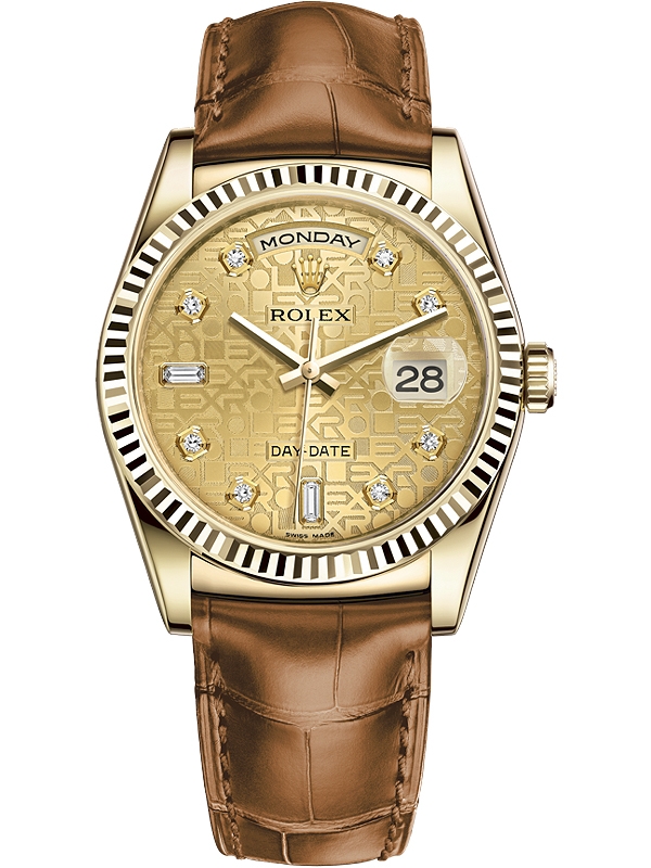 Rolex Day-Date 36 Yellow Gold Champagne Jubilee Dial Cognac Leather Watch 118138